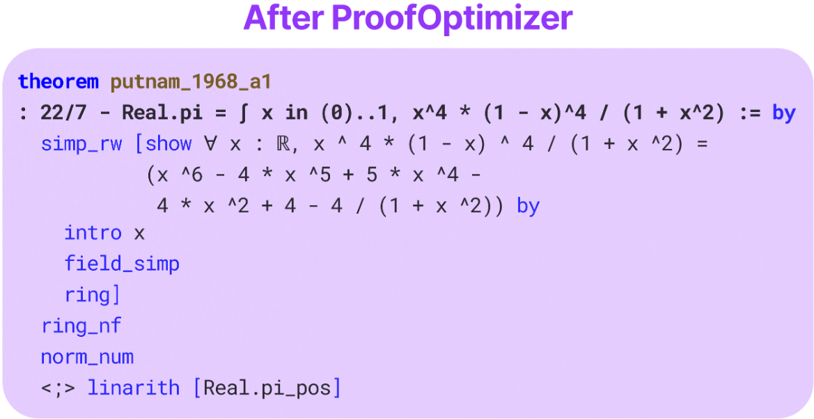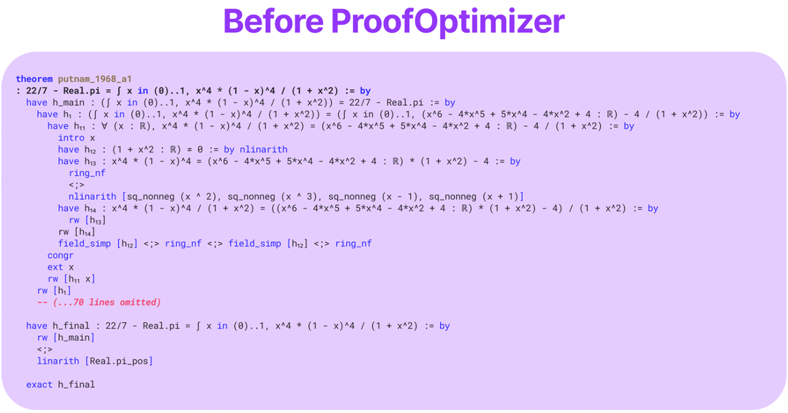 LLMs trained with reinforcement learning often produce formal proofs that are correct but excessively long and opaque. We introduce ProofOptimizer, a system that automatically shortens and cleans up these proofs while preserving correctness. It reduces proof length by up to 87% on MiniF2F and 57% on PutnamBench, making formal proofs more readable and revealing clearer mathematical insights.